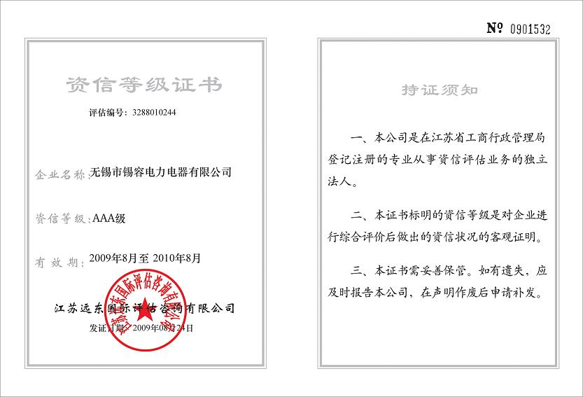 Credit rating certificate release time:2020-07-20 04:33:09source:Wuxi Xirong Electric Appliance Co., Ltd.Click:1686
